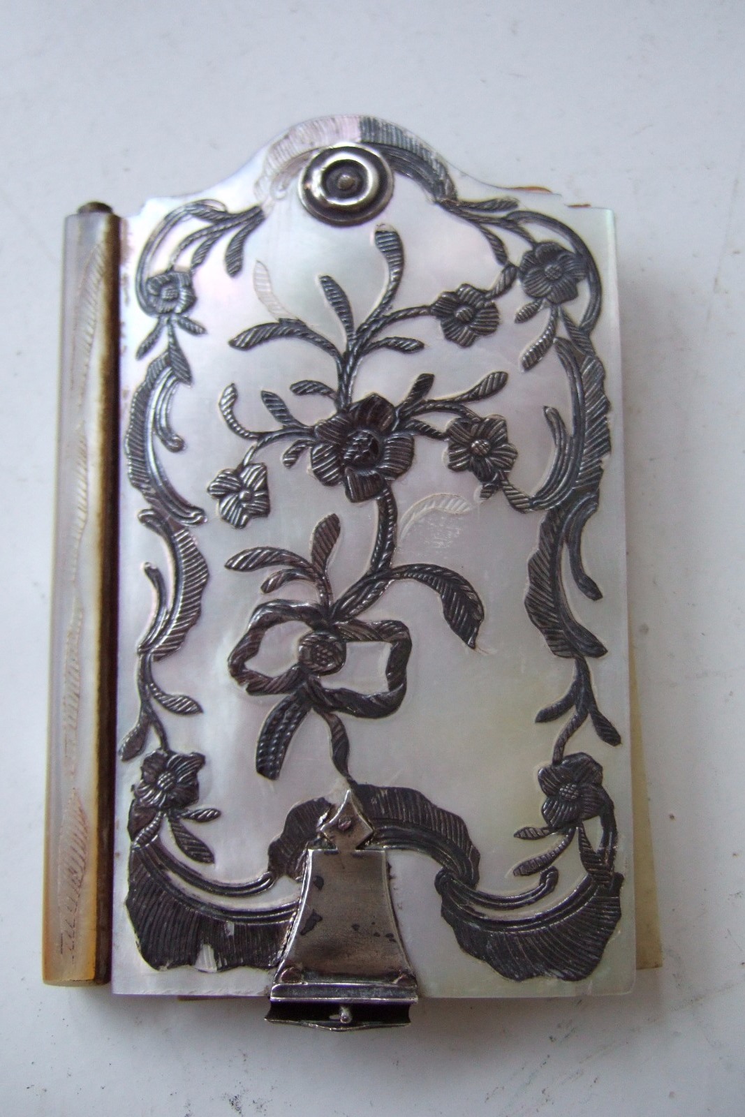 19th Century Aide Memoire with Mother of Pearl Covers Inlaid with Silver & Ivory Leaves (1 of 1)