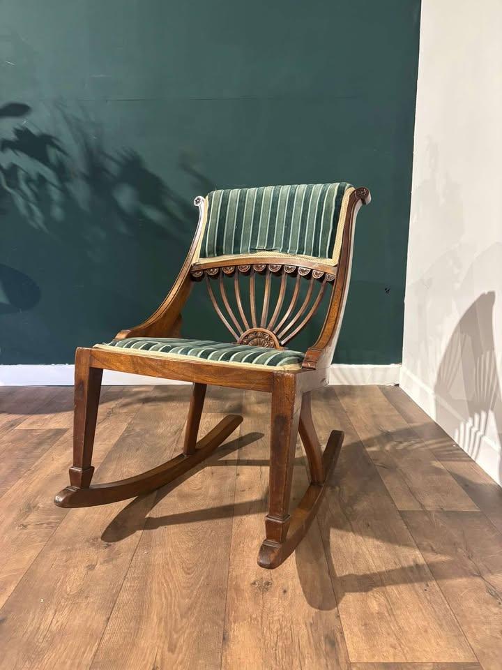 19th Century Beech Rocking Chair Upholstered in a Green Striped Material