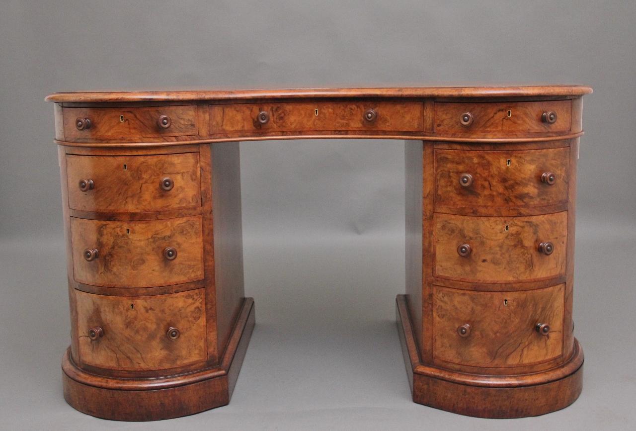 19th Century Burr Walnut Pedestal Kidney Shaped Desk