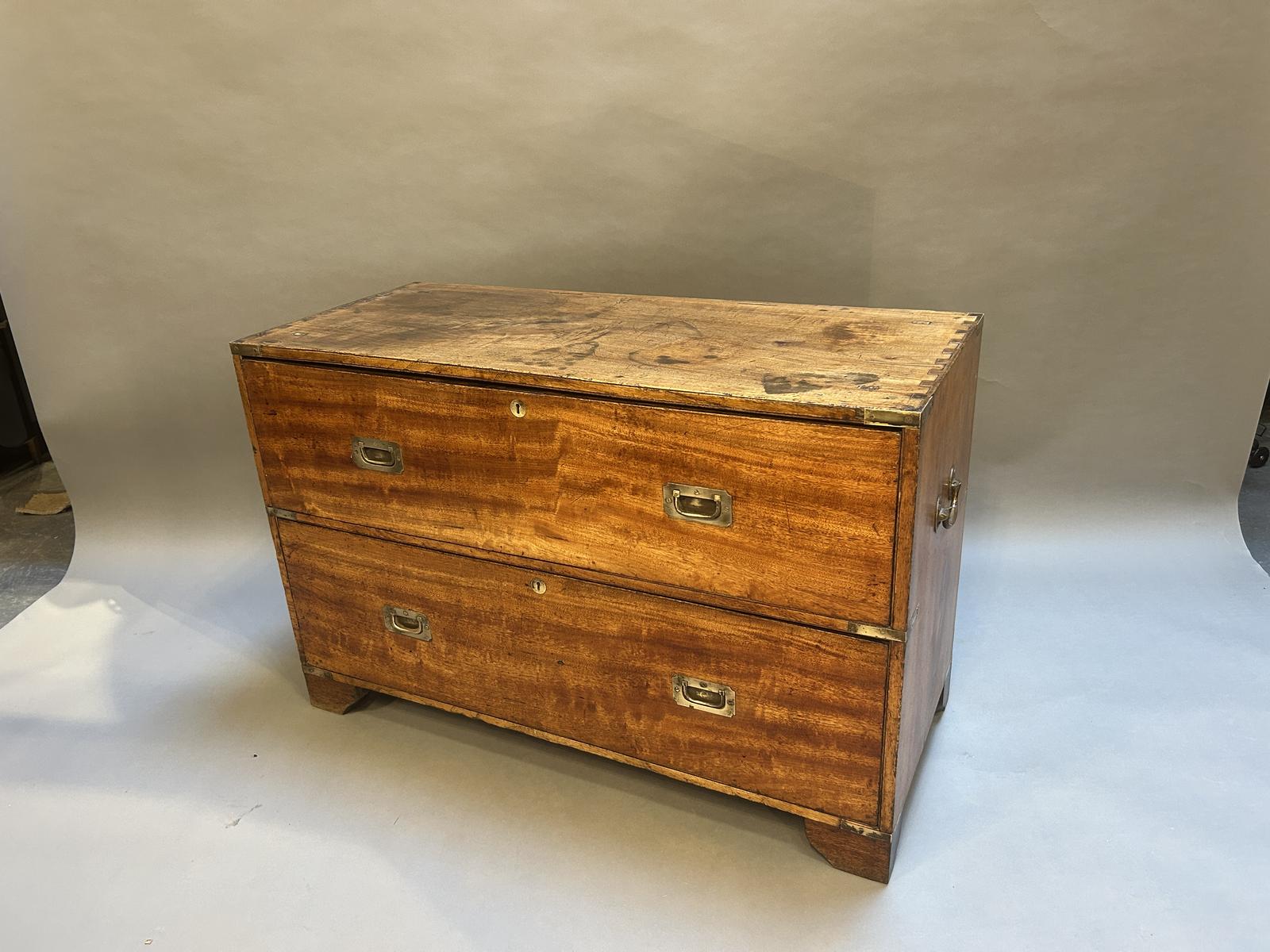 It is of good colour and well figured this camphorwood chest ( bottom section of original 2 part, probably Colonially made) has brass bindings throughout, the 2 drawers (Bramah locks) with sunken brass handles and carrying handles to each side, raised on block feet.