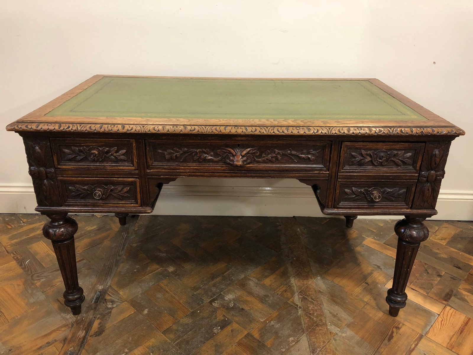 19th Century Carved Oak Gothic Revival Writing Desk with Inset Green Leather Top (1 of 1)