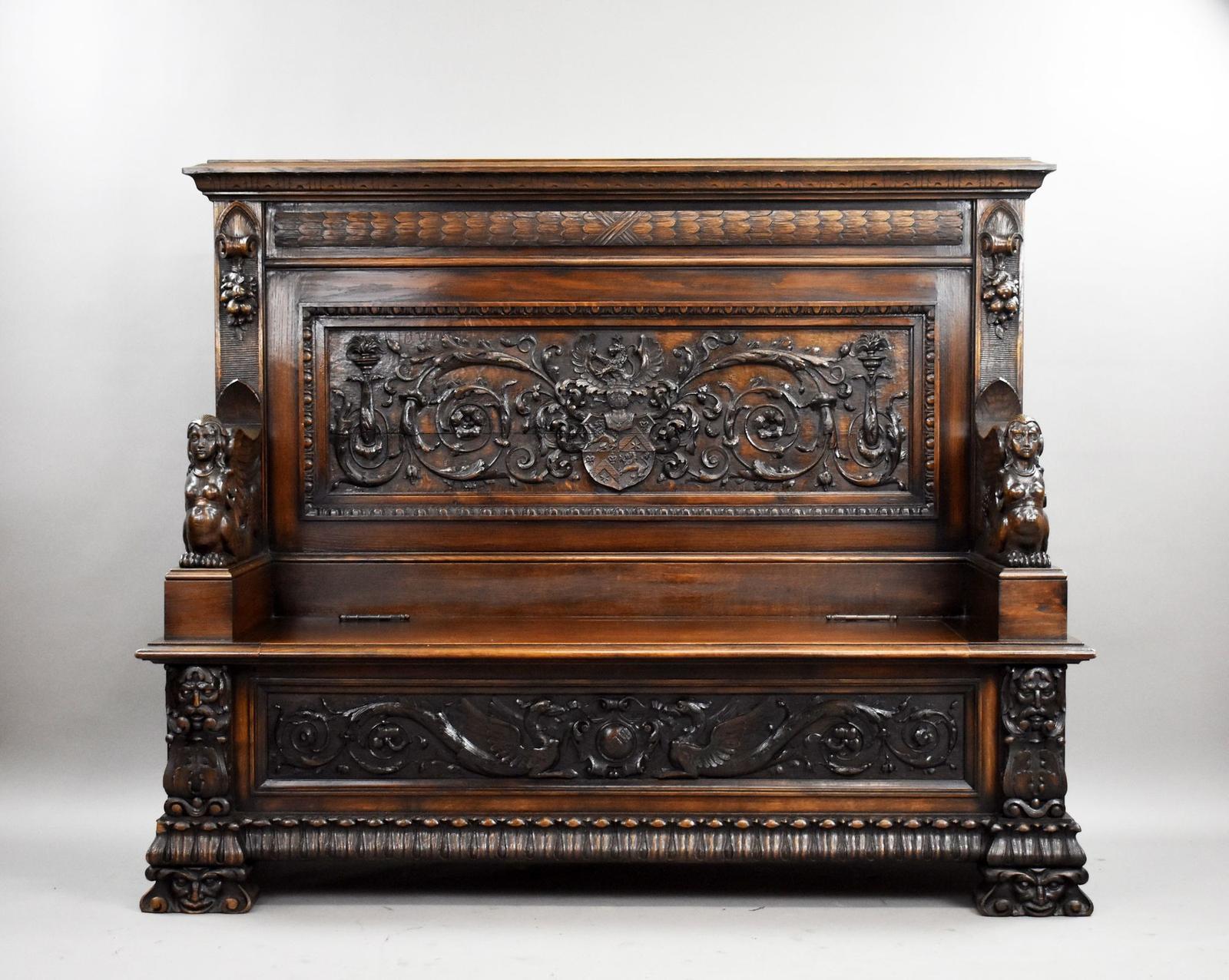 A striking and highly decorative 19th century carved oak hall bench of impressive scale and craftsmanship. The bench features a richly carved back panel centred with a heraldic shield beneath a crowned crest, surrounded by scrolling foliage and classical motifs. Flanking the panel are architectural uprights with Gothic influences and carved fruit clusters, while the arms are supported by finely carved winged mythical creatures resembling sphinxes or griffins.