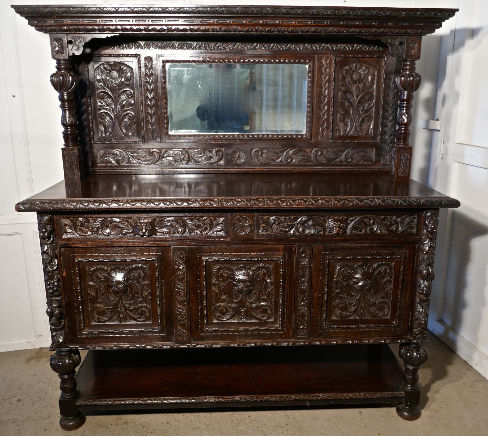 19th Century Carved Oak Mirror Back Dresser with Tree of Life & Green Man Carvings