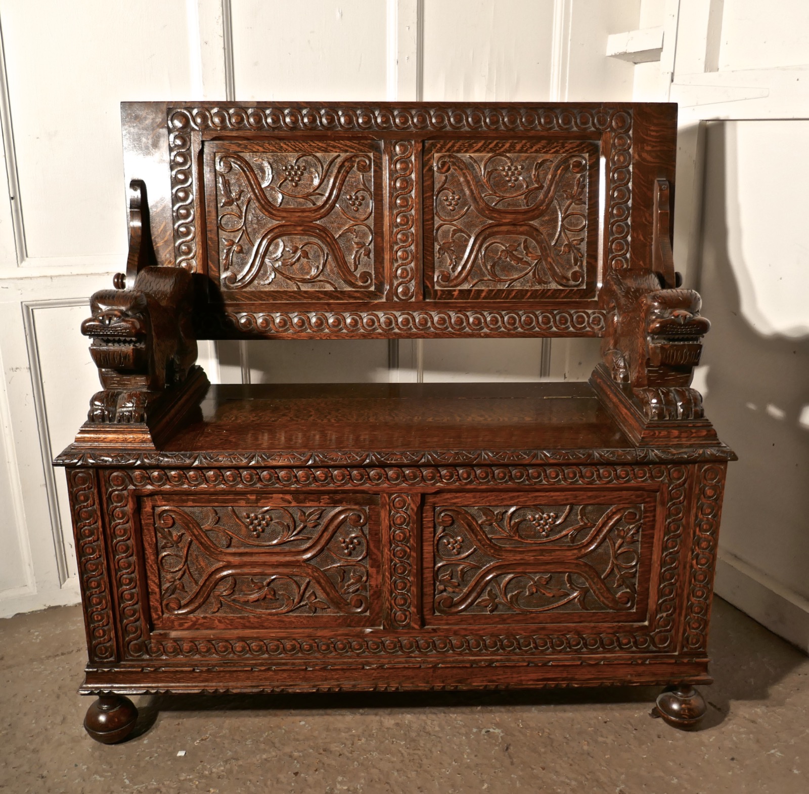 19th Century Carved Oak Monks Bench Settle, Hall Table