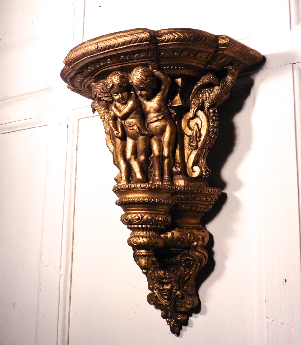 19th Century Carved Wood Gilt Wall Bracket, Putti, Eagles