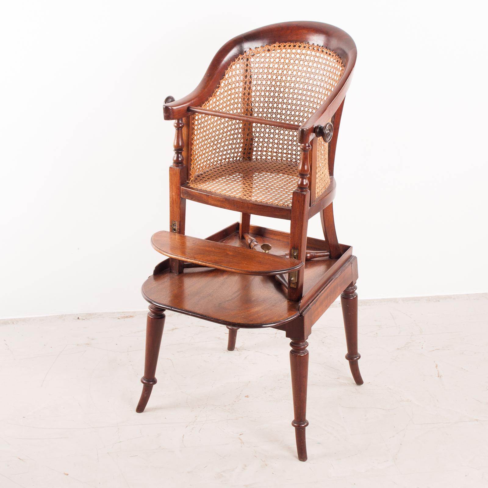 This 19th Century child's caned mahogany tub highchair is a well-drawn and quite sophisticated example. The chair itself is of Bergere style with a caned seat and curved back. It has a restraining bar and an adjustable foot rest and is connected to the stand by a threaded thumbscrew. The stand has finely turned, out swept legs to aid stability. This highchair would also house a Teddy or soft toy for added decorative appeal.