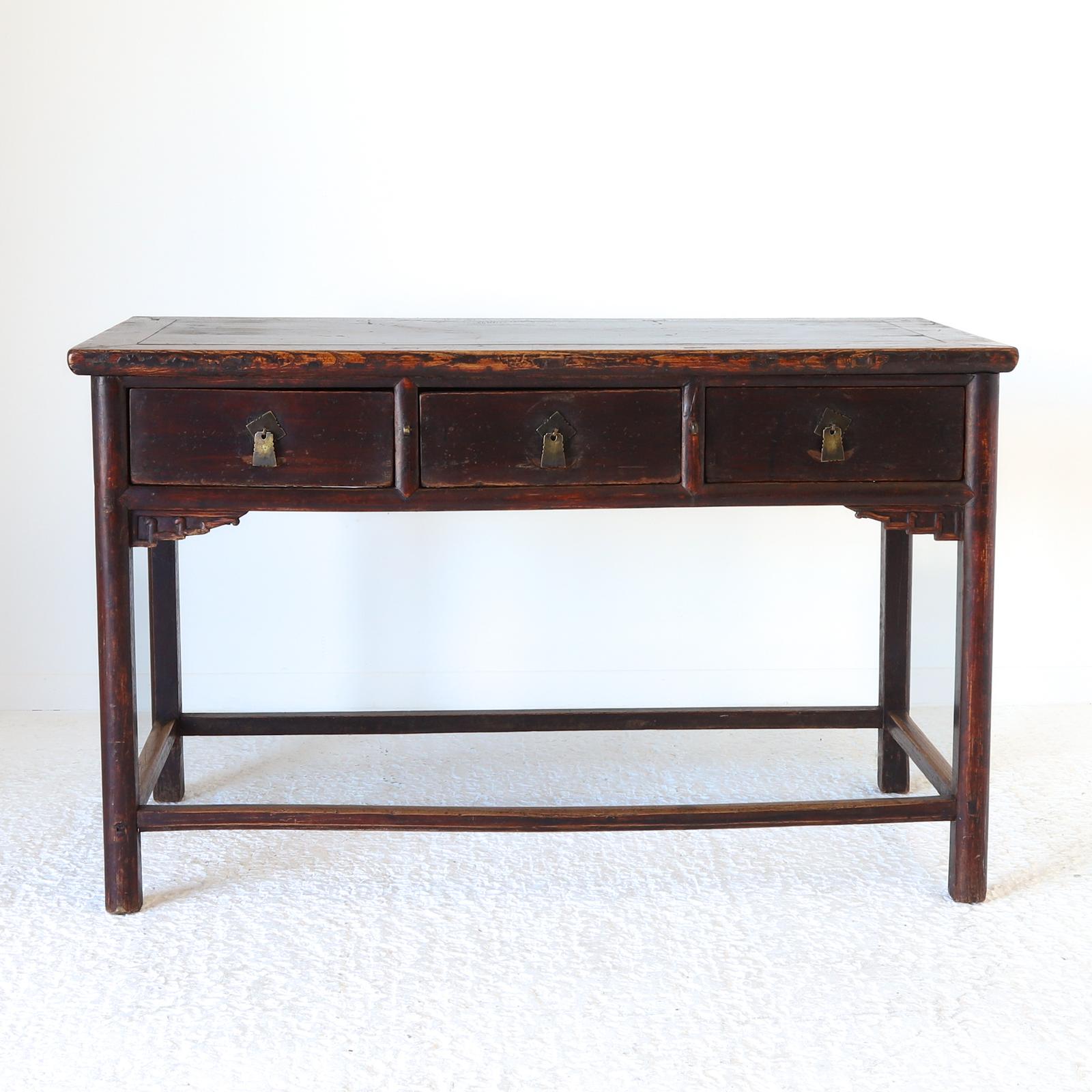 19th Century Chinese Elm 3 Drawer Scroll Console Table c.1850