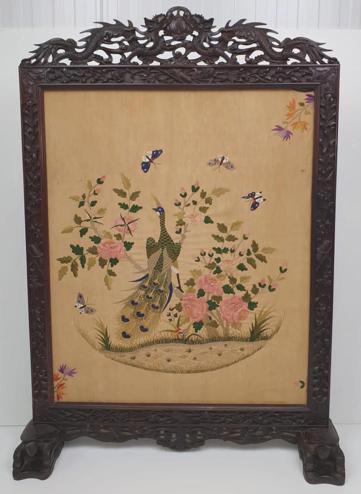 19th Century Chinese Mahogany Fire Screen with Silk Embroidered Panel