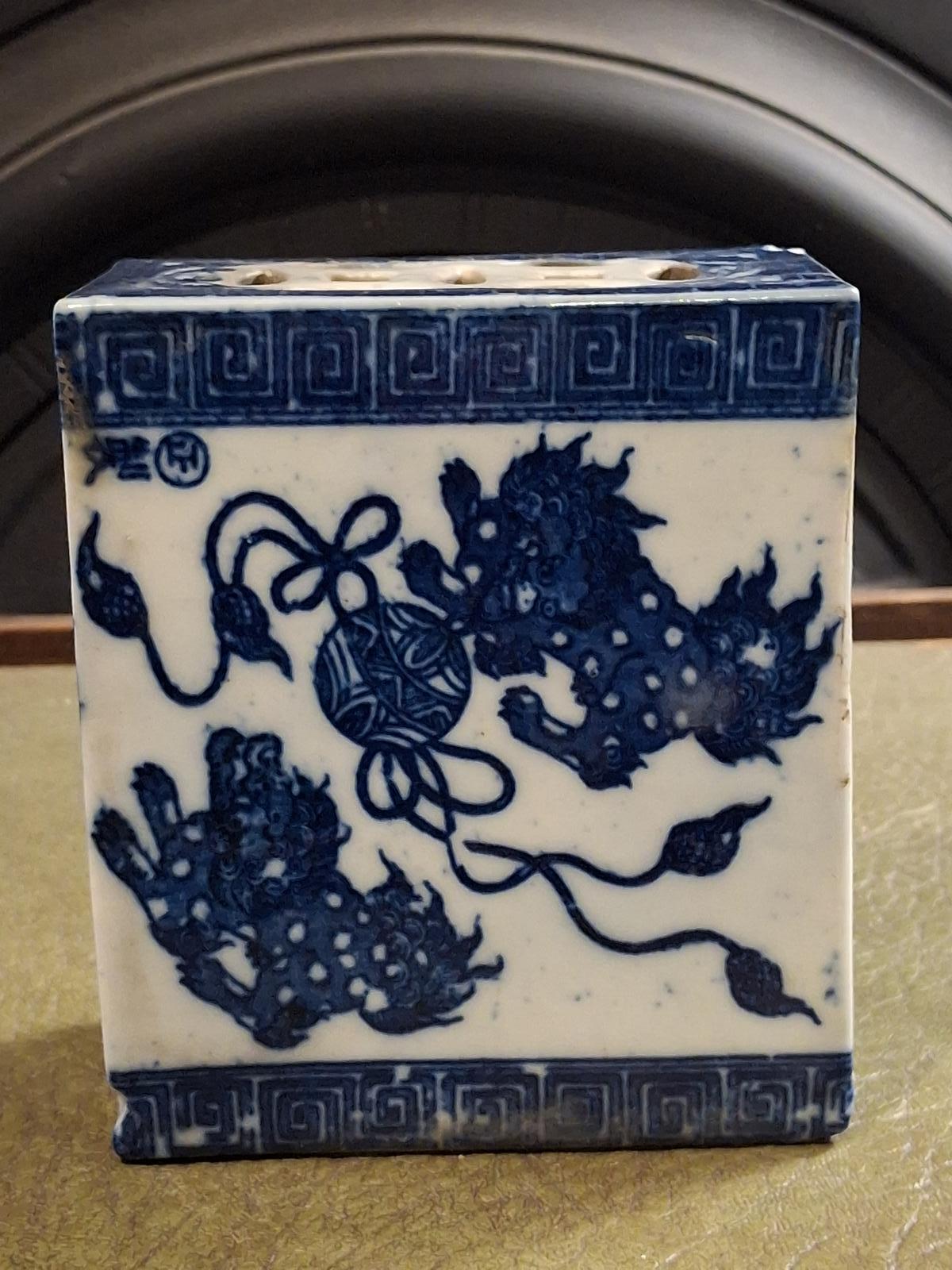 Chinese porcelain blue and white porcelain Opium pillow from the Qing Period dating around 1850 it is decorated with dogs of Fo and is signed, it has a chip on a corner which has been glazed over, a chip to the top corner but in overall good condition.