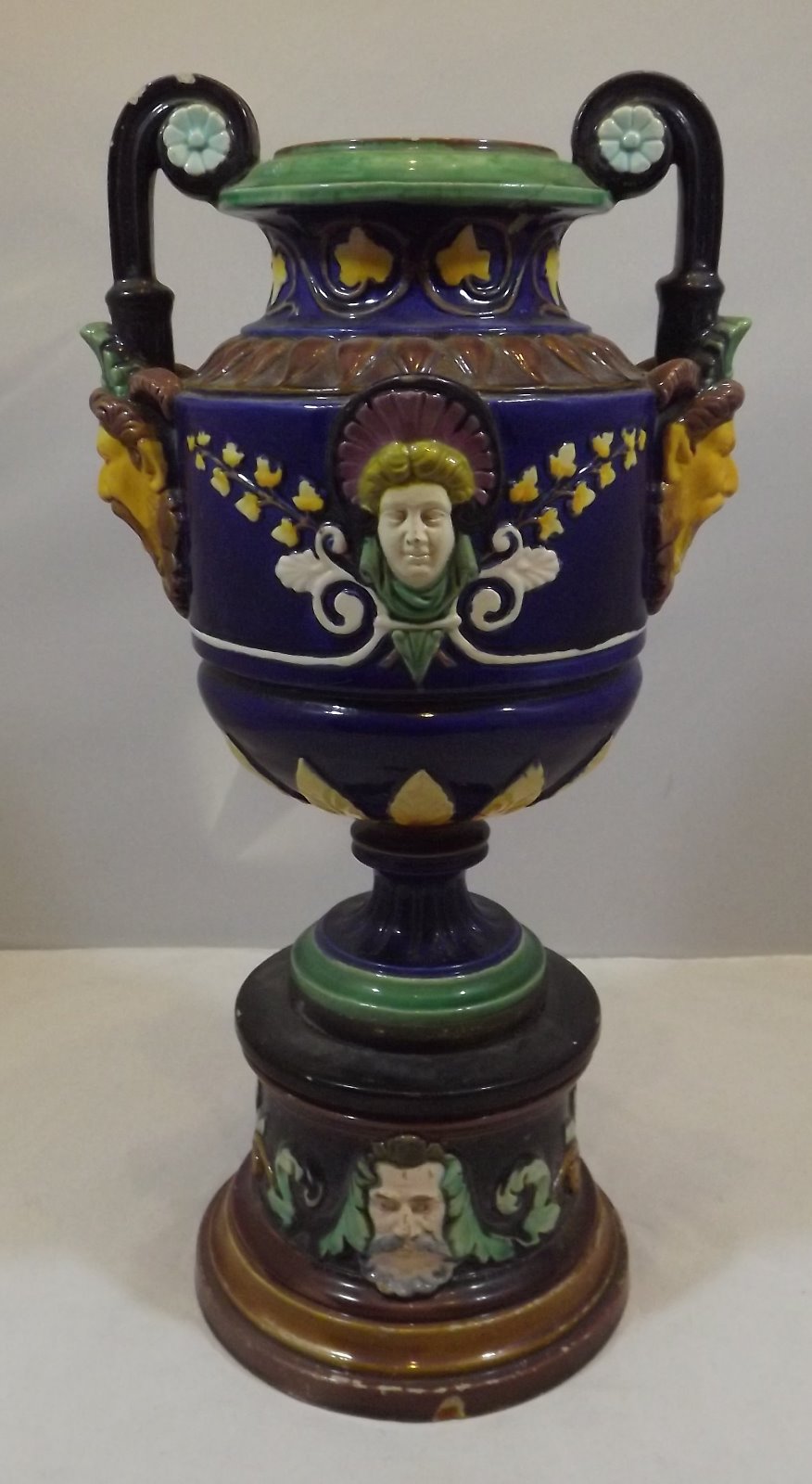 19th Century Continental Majolica Urn on Pedestal