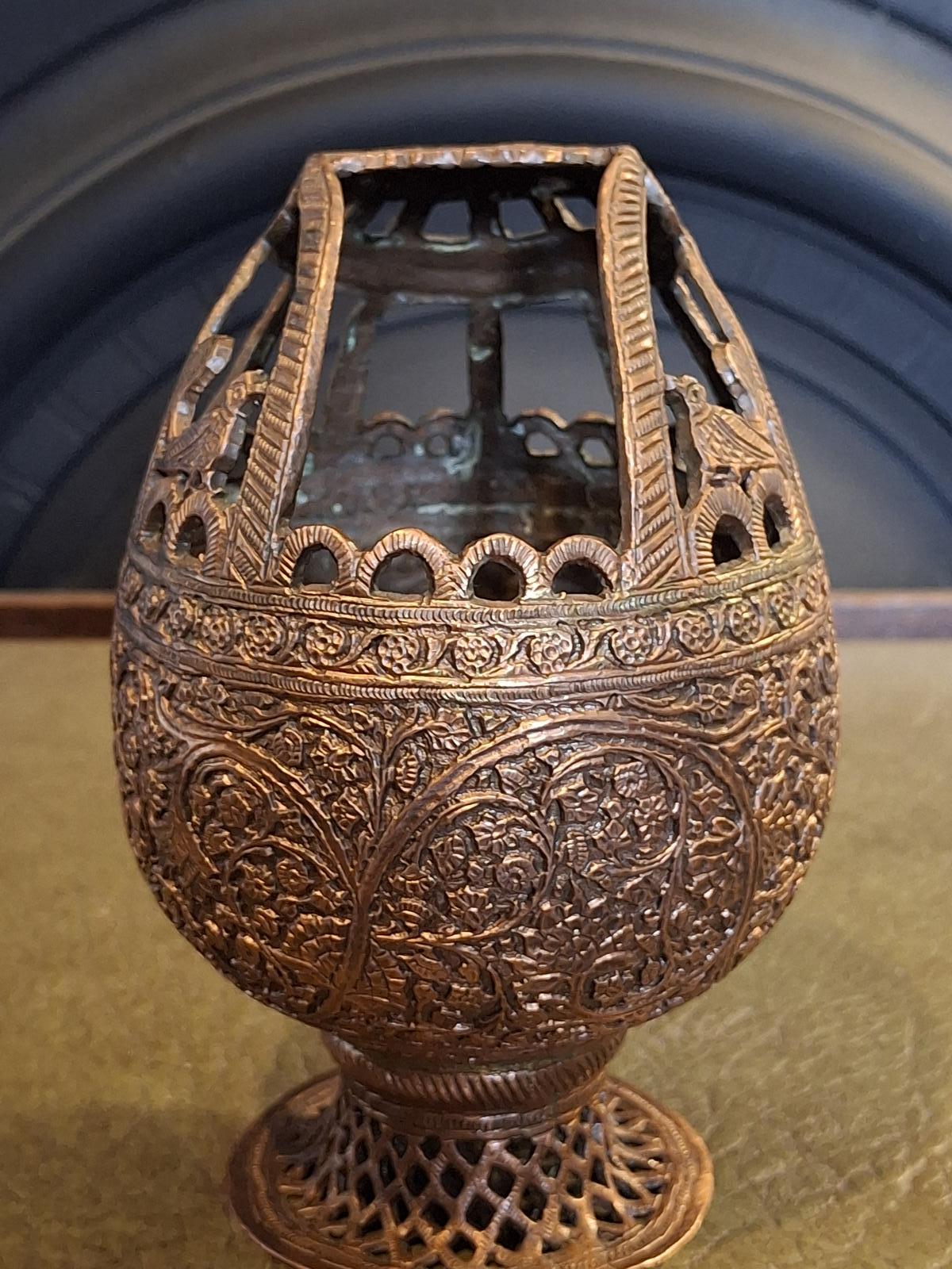A beautiful and incredibly decorative antique Kashmiri Kangri or incense burner it is a copper colour but quite heavy for size so very possibly bronze , it ornately decorated with leaves and vines and stands on a pierced foot there is one tiny split on the foot and a very small dent to the side, it displays beautifully and stands 16cm high and 10.5cm in diameter.