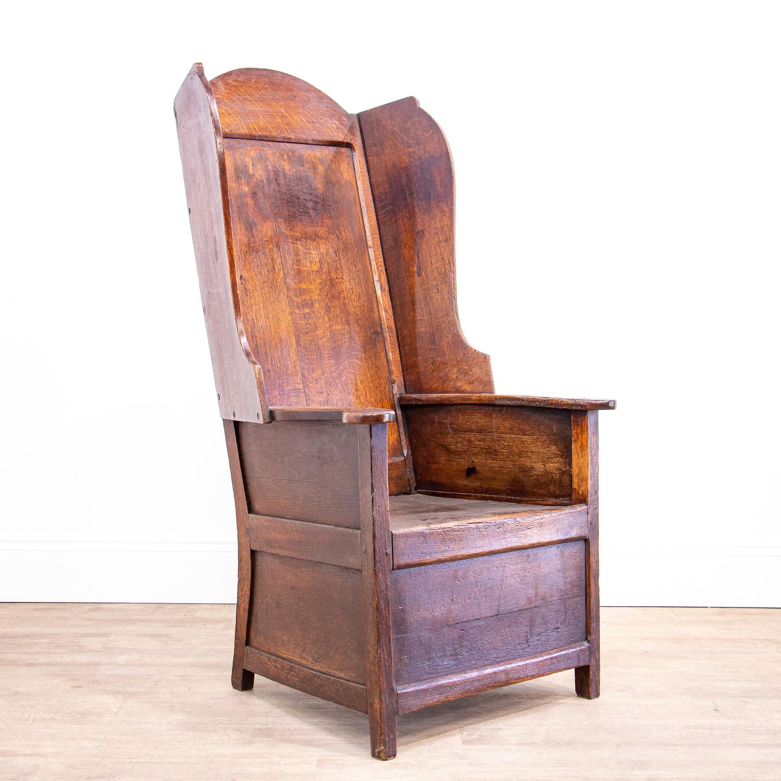 A charming, rustic country oak lambing chair, this has the traditional high wing back and box area under the seat. It will look wonderful by a cottage fireplace, or in a large country kitchen, with a big comfortable cushion.