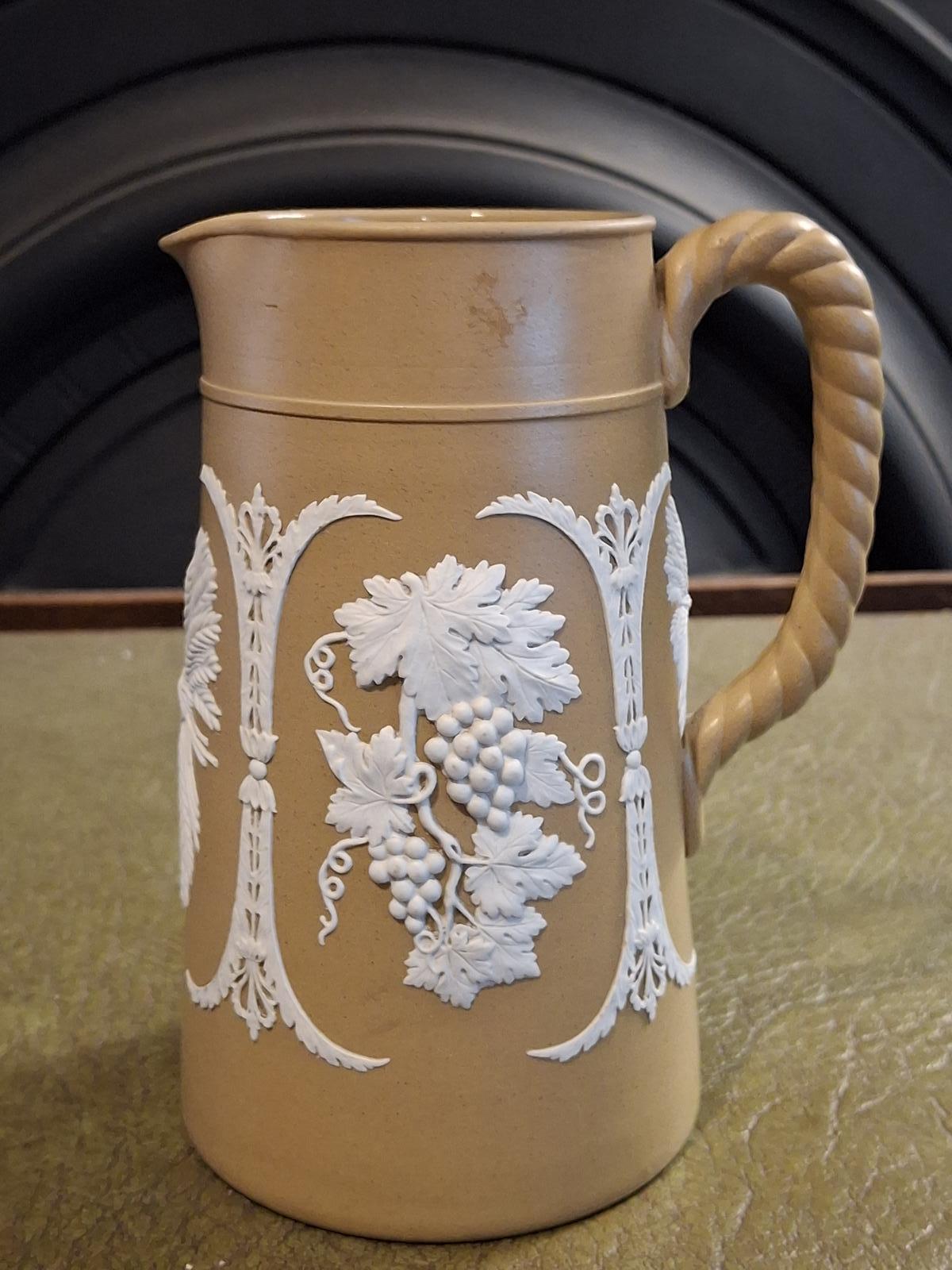 19th Century James Dudson paxton jasperware milk pitcher No 996 Harvest pattern, decorated with sheaves of corn and grape and vine pattern on one side and blackberries on the other it has a rope handle it has an impressed Mark 24 and a scratch 996 pattern number to the base it is in perfect condition and stands 16.75cms high thanks for looking