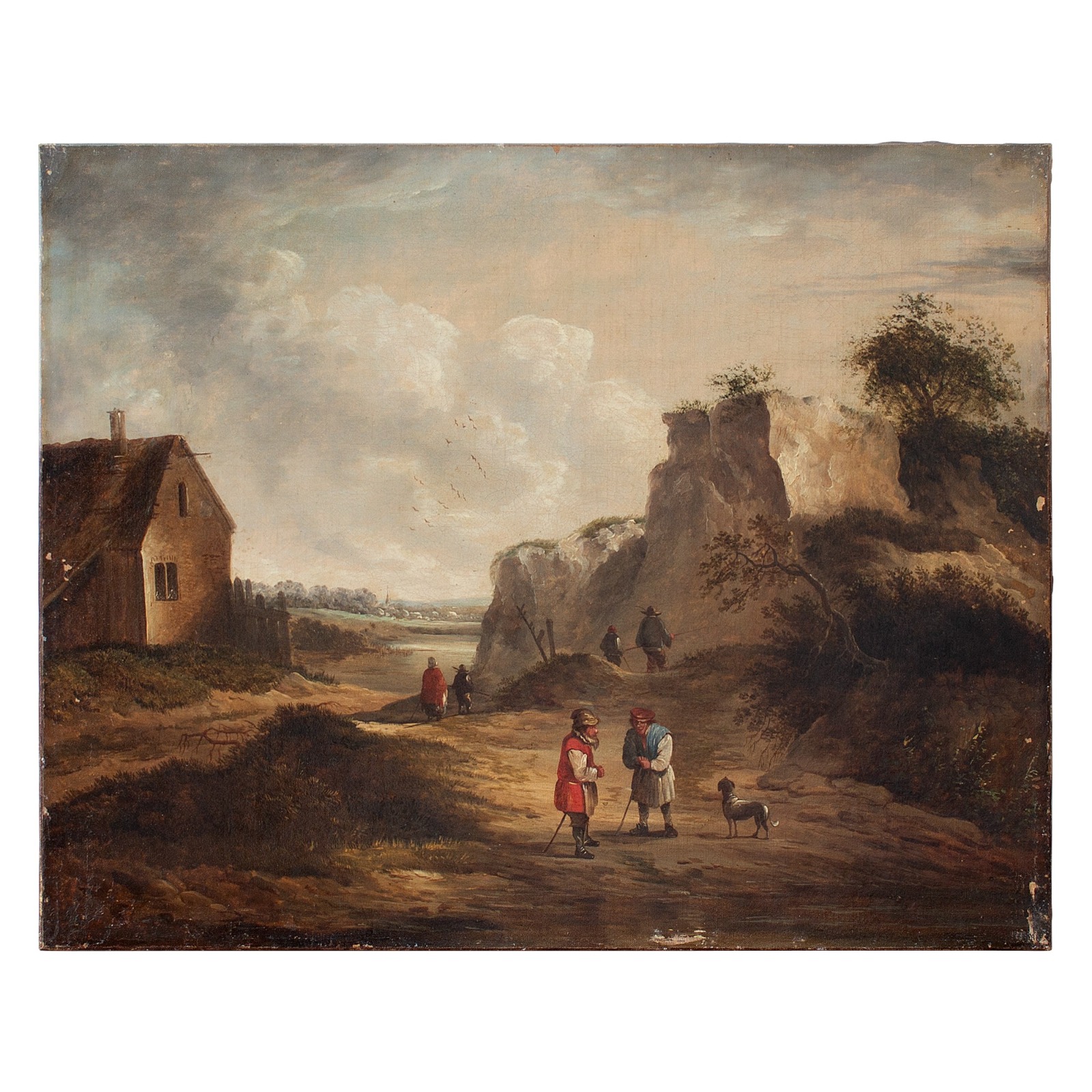 19th Century Dutch School Landscape with Villagers, Oil Painting