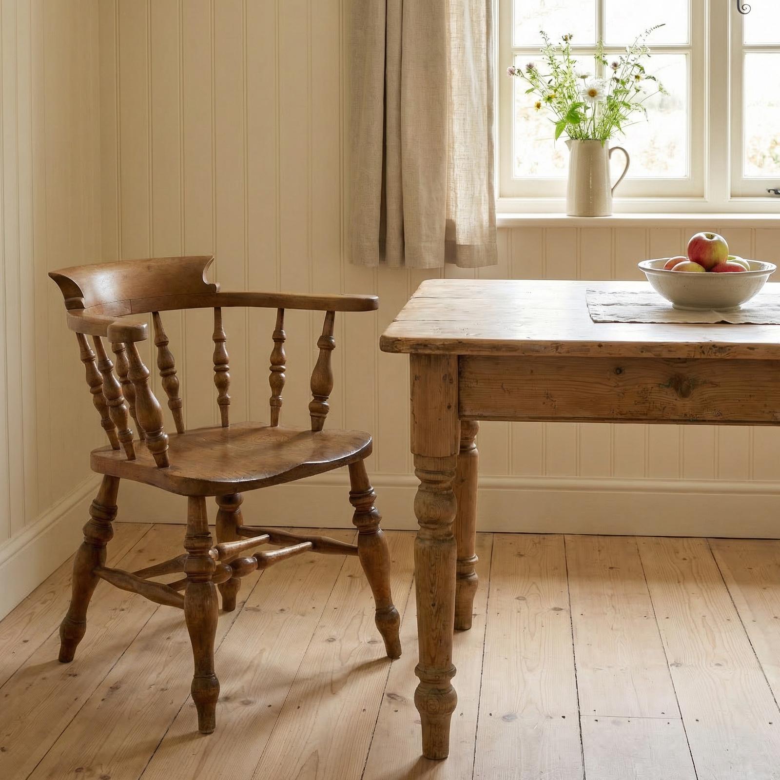 The Old Yard has clarified that the 19th Century Elm Smokers Bow Chair / Captains Chair (LA564367) is genuinely of the period declared with the date/period of manufacture being 19th Century