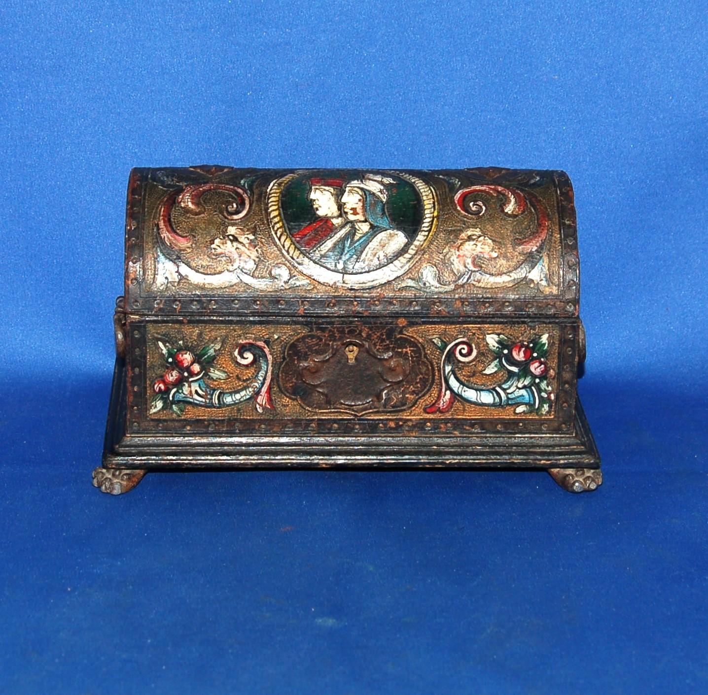 19th Century Embossed Leather Medieval Gothic Casket, Hand Painted Details