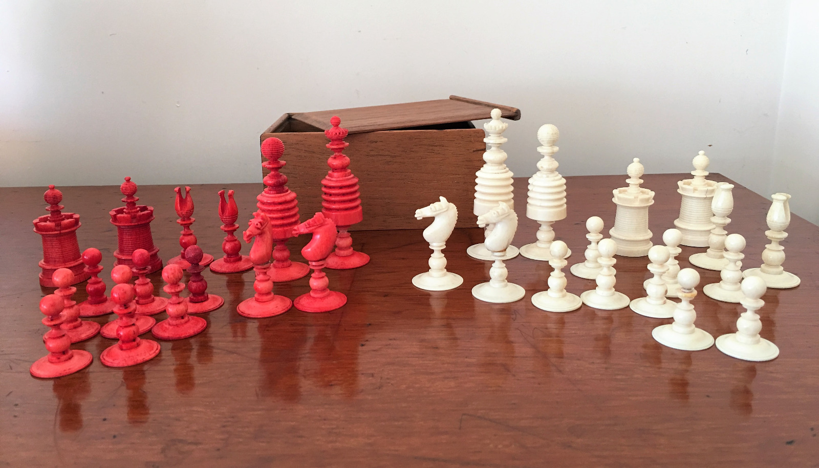19th Century English Barleycorn Design Turned Bone Chess Set with Mahogany Box
