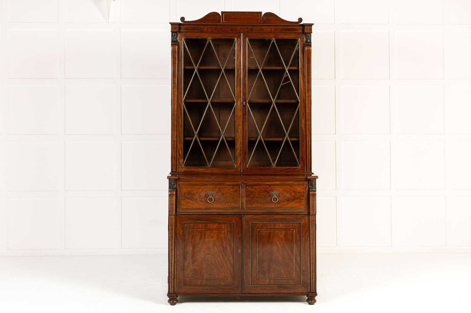 Grand Scale 19th Century English Regency Mahogany and Brass Inlaid Secretaire Cabinet or Bookcase.