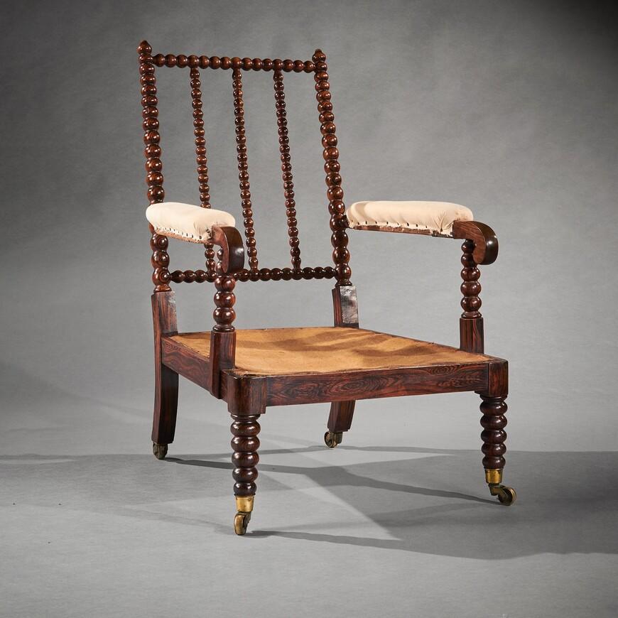 19th Century Faux Rosewood Bobbin Turned Open Armchair on Brass Cup Castors