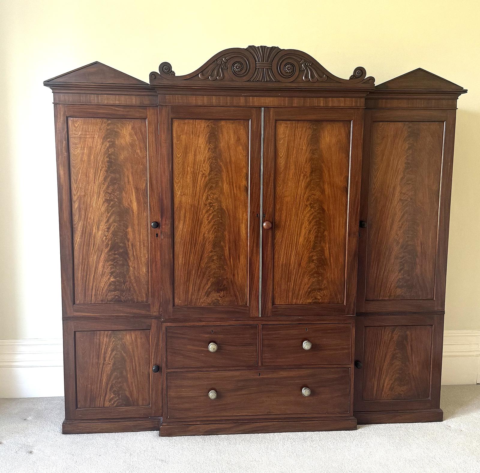 19th Century Figured Mahogany Break Front Wardrobe