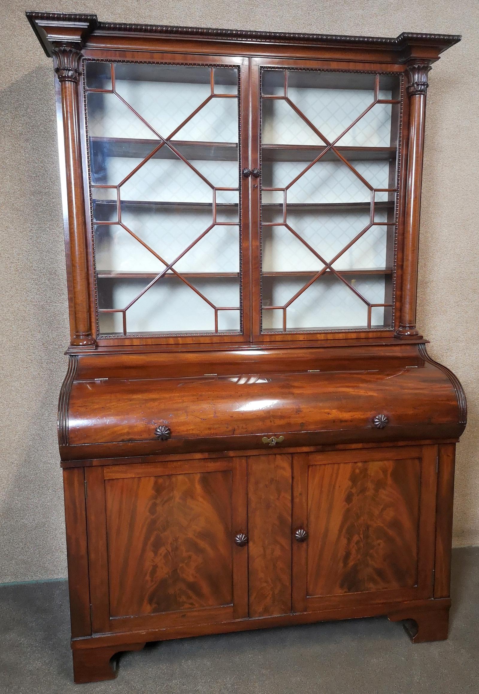 19th Century Figured Mahogany Cylinder Bureau Bookcase