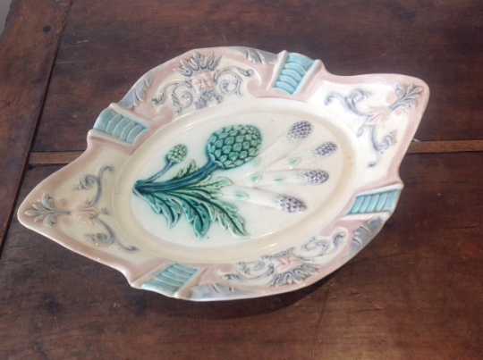 19th Century French Babotine Majolica Asaparagus & Artichoke Serving Plate Marked, Sarreguemines Style