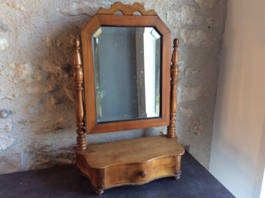 19th Century French Cherry Wood & Satinwood Ladies Dressing Table Mirror with Shaped Drawer