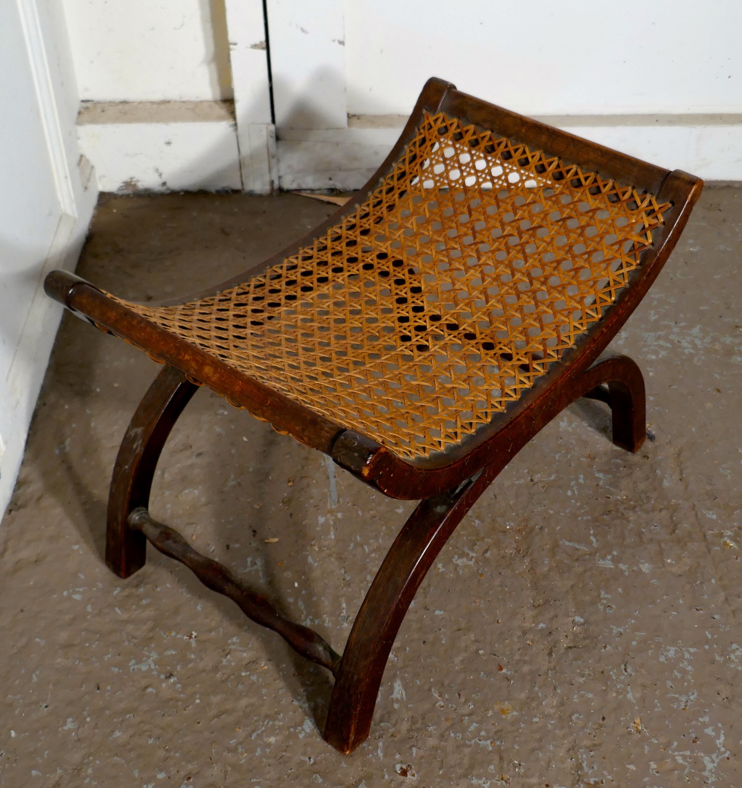 19th Century French Oak X Frame Stool, with Flat Caned Seat