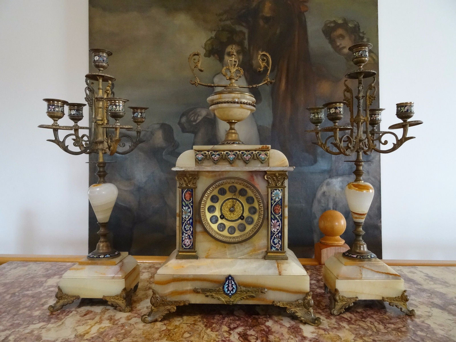 19th Century French Onyx & Chinoiserie Clock Garniture Candelabra Candle Set - Serviced