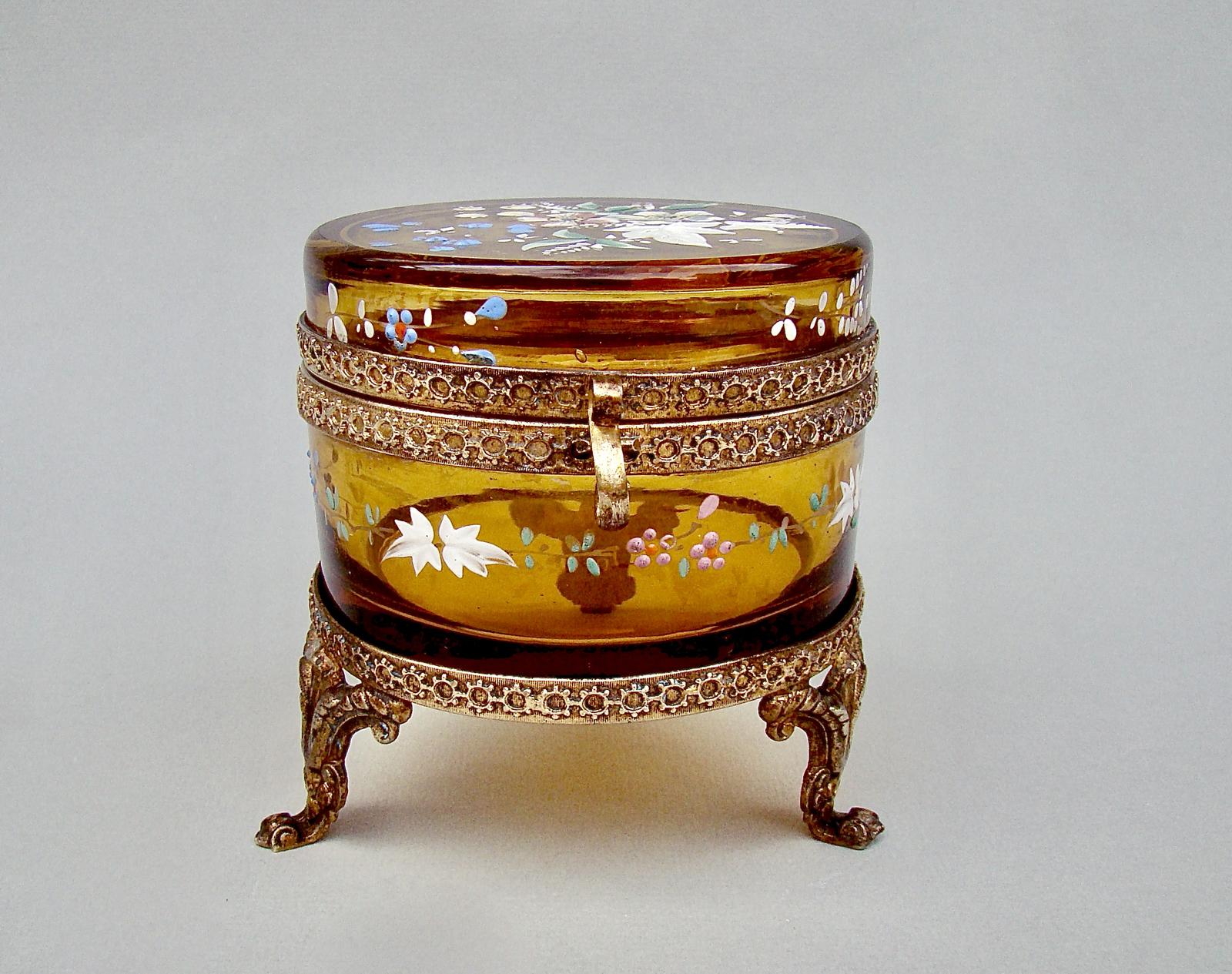 19th Century French Ormolu & Enamelled Amber Glass Dressing Table Jar c.1890