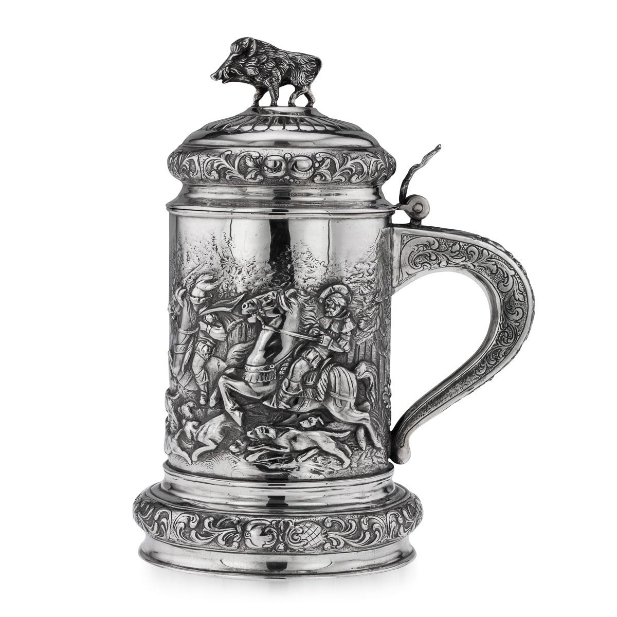 19th Century German Solid Silver Embossed Figural Beer Tankard - Hanau c.1890