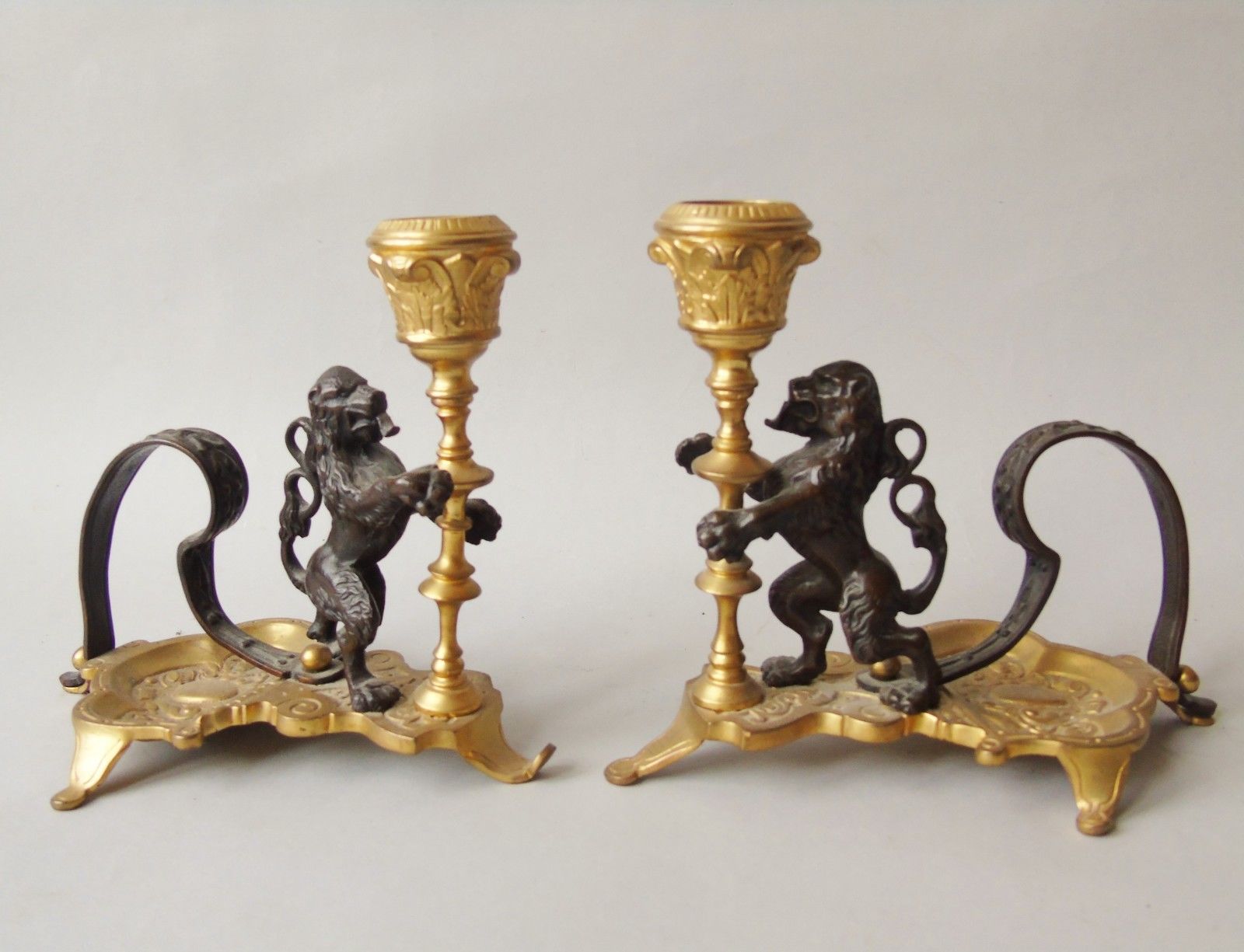 19th Century Gilt Bronze RAmpant Lion Candlesticks (1 of 1)