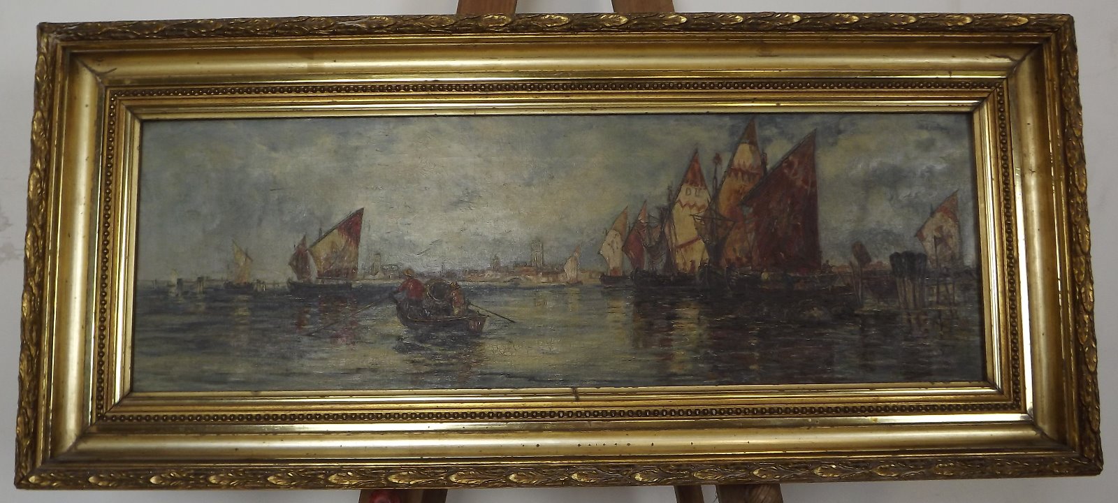 19th Century Gilt-Framed Oil Painting of a Harbour Scene
