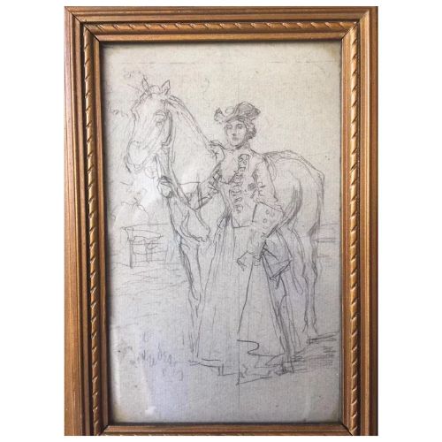 19th Century Gilt Framed Pencil Illustration of a Regal Lady with Horse