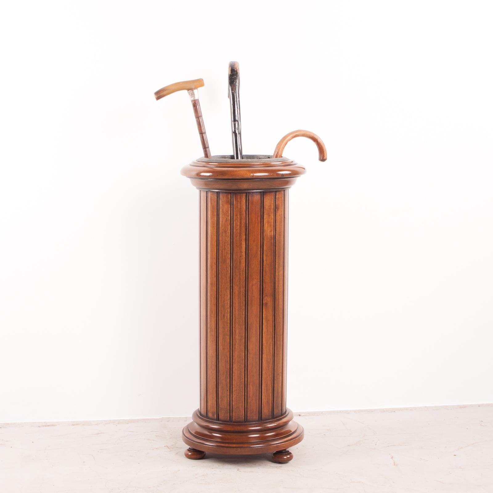 This good quality 19th Century antique walnut umbrella stick stand would make a very welcome addition to a hallway, making an instant impression to visitors. Standing on turned bun feet, with generous mouldings to the top and bottom. The beautifully made cooper constructed main body, has a finely worked decorative bead to the edge of each individual strip. Lined with a metal container to contain any drips for added practicality. Constructed of good-sized timber the piece is of a good weight that contributes to excellent stability. The walnut, which this piece is made from in the solid, has mellowed to a lovely warm hue.
