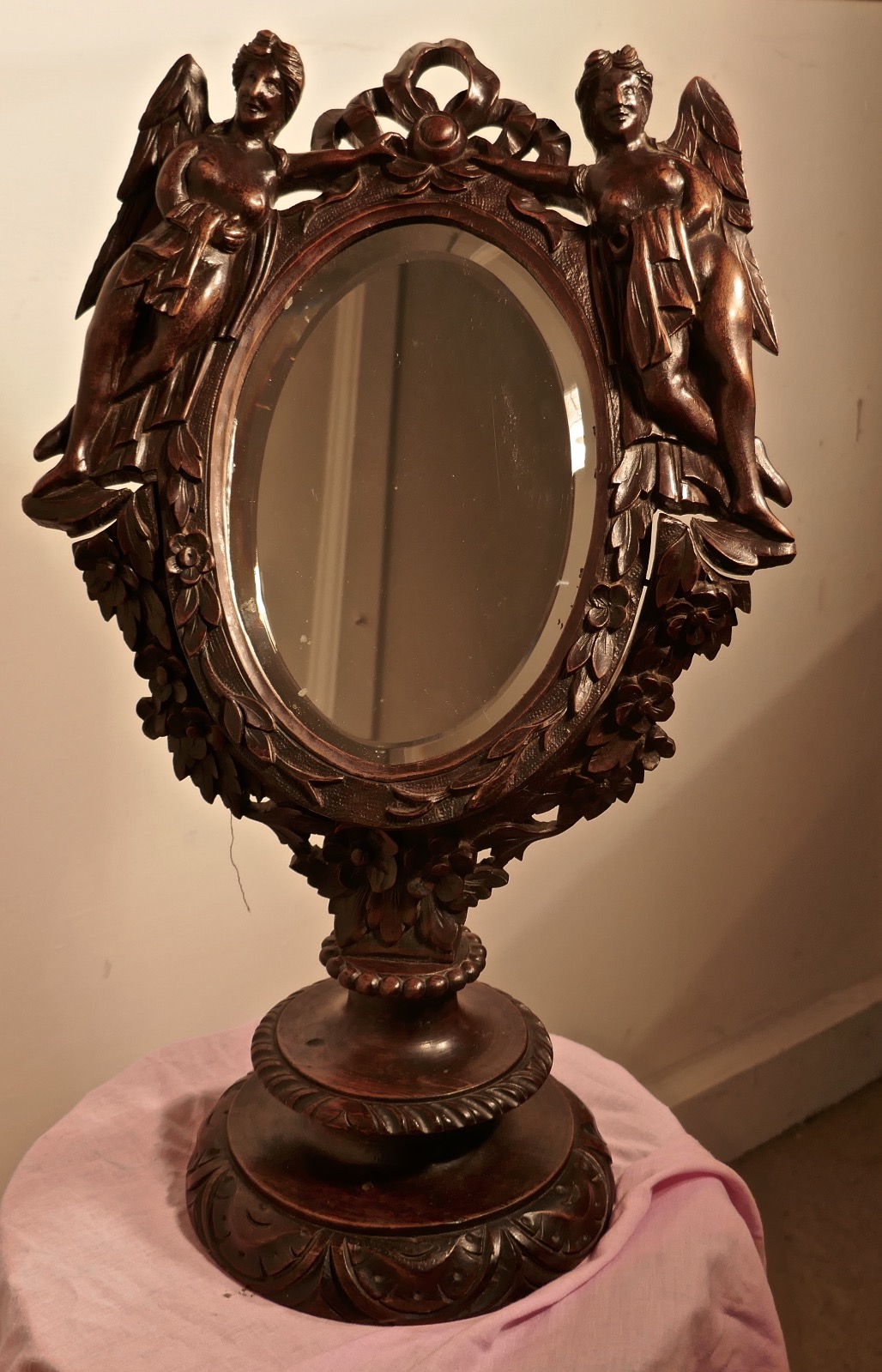 19th Century Gothic Walnut Vanity or Shaving Mirror, Carved with Angels