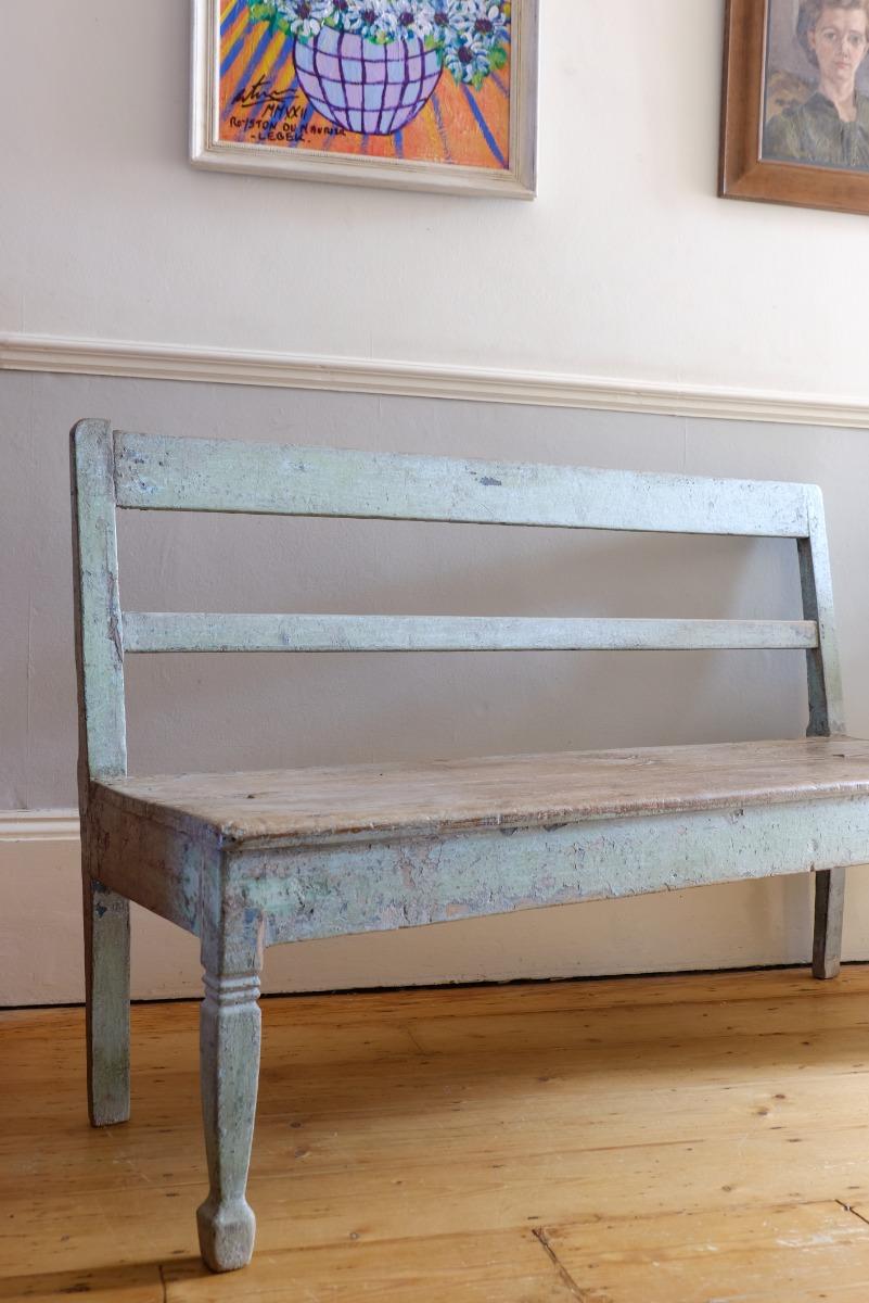 19th Century Green Painted & Elm Hall Bench