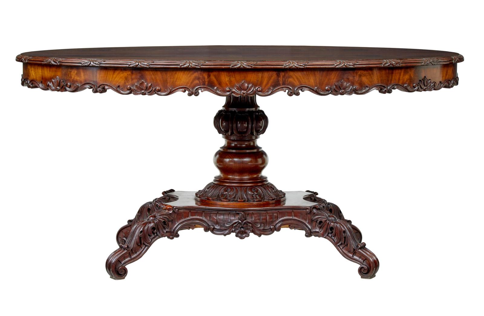 19th century hand carved mahogany center table circa 1880. Stunning quality center table from scandinavia. Oval top which has been veneered in bookmark flame mahogany, fluted edge with carved acanthus leaf detailing. further applied swags and floral carving to the apron. supported by a bulbous turned column with carved collar. platform base with further carving and standing on 4 profusely carved scrolling feet. Beautiful table to adorn any hallway or foyer, or even in the living room. 1 small swag missing to base which is photographed, minor surface fading to top surface. recently re-polished in our workshop.