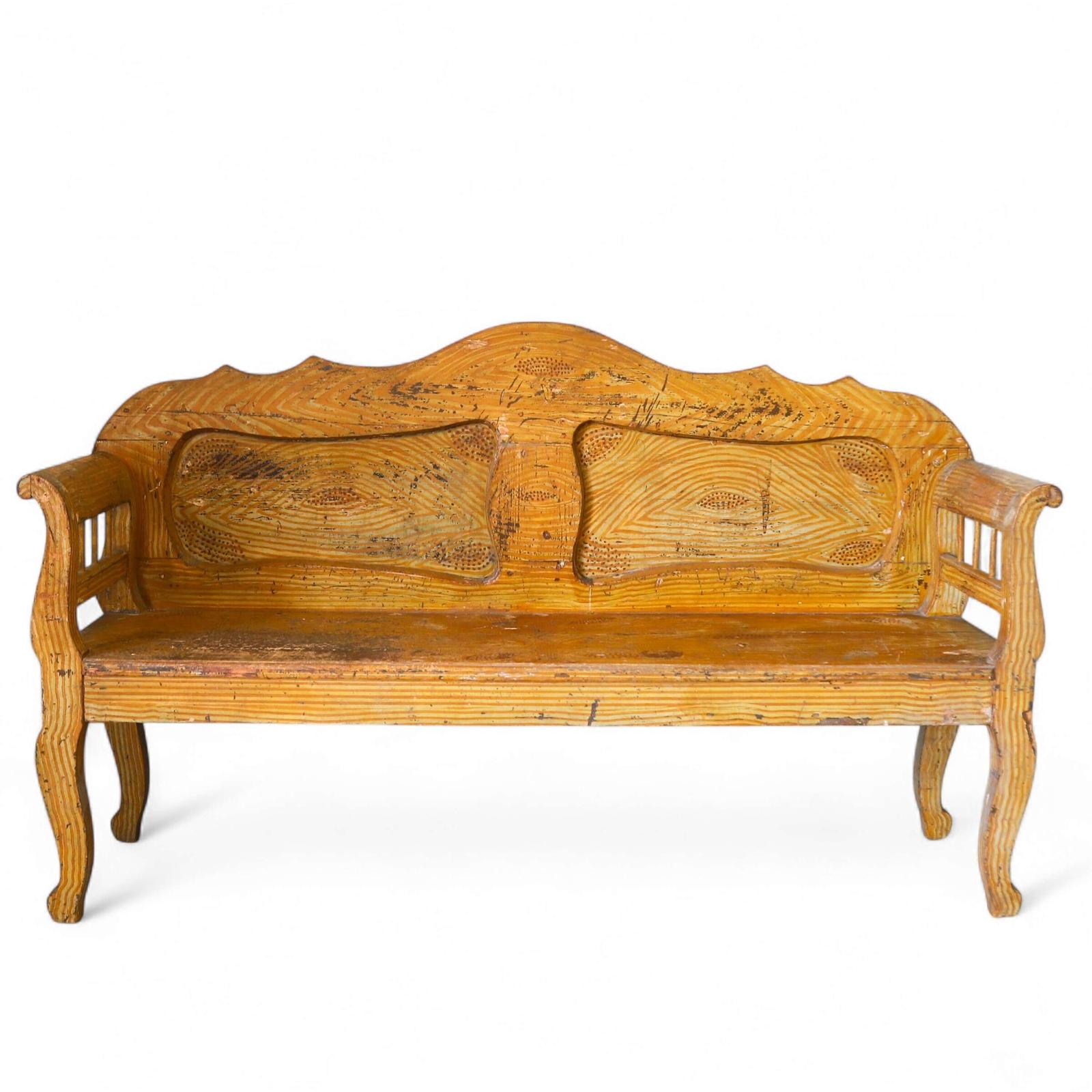 The surface retains its original hand painted finish, with scumbled graining and hand-drawn line work applied to emulate more expensive timber, a popular decorative practice in the 19th century, especially in rural Britain and northern Europe. What makes this bench particularly engaging is the lively dotted detailing and patterned motifs scattered across the frame and back - a wonderfully human touch that gives the piece its individuality and sense of story. The shaped top rail, curving arms and swept legs add further elegance, balancing rustic honesty with a confident silhouette.