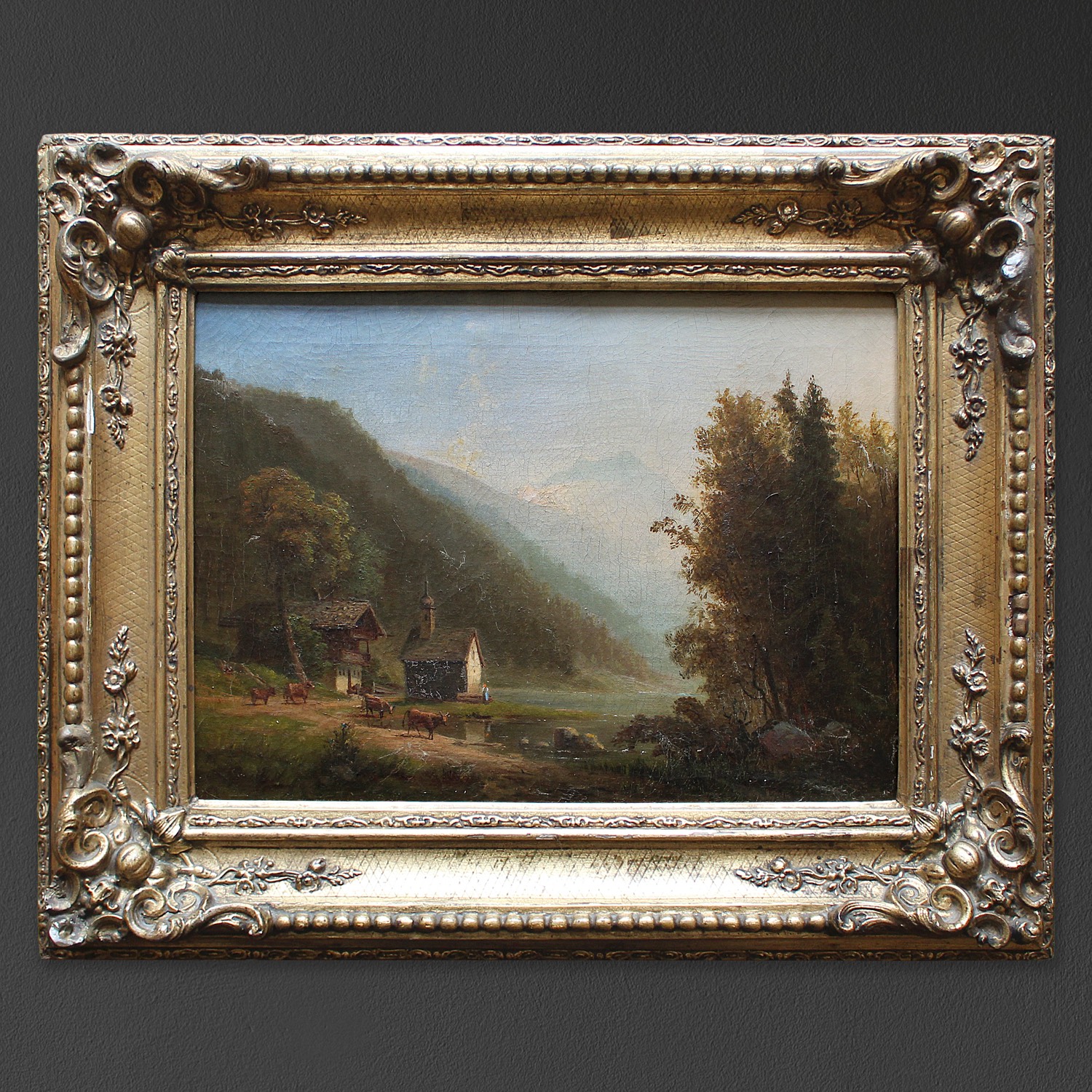 19th Century Idealised Swiss Landscape, Original Antique Oil Painting, Mountains, Cows
