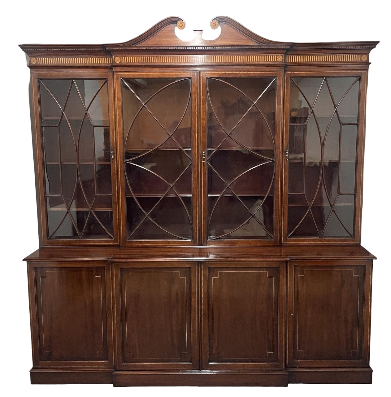 A fabulous quality 19th Century inlaid mahogany breakfront bookcase, having a moulded edge cornice with dentil moulding and a swan neck pediment at the centre with decorative circular fan inlays, the frieze below having further decorative inlay, having four astrigal glazed doors below opening to reveal three adjustable shelves at the sides and two adjustable shelves at the centre, the bottom section having four inlaid panelled doors opening to reveal two adjustable shelves in each section, supported on a plinth base. The bookcase is in excellent condition and having a nice warm rich mahogany colour. Circa 1880.