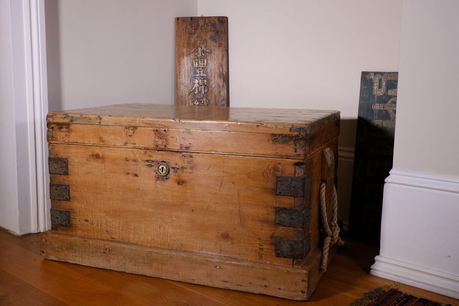19th Century Iron Bound Pine Trunk with Rope Handles