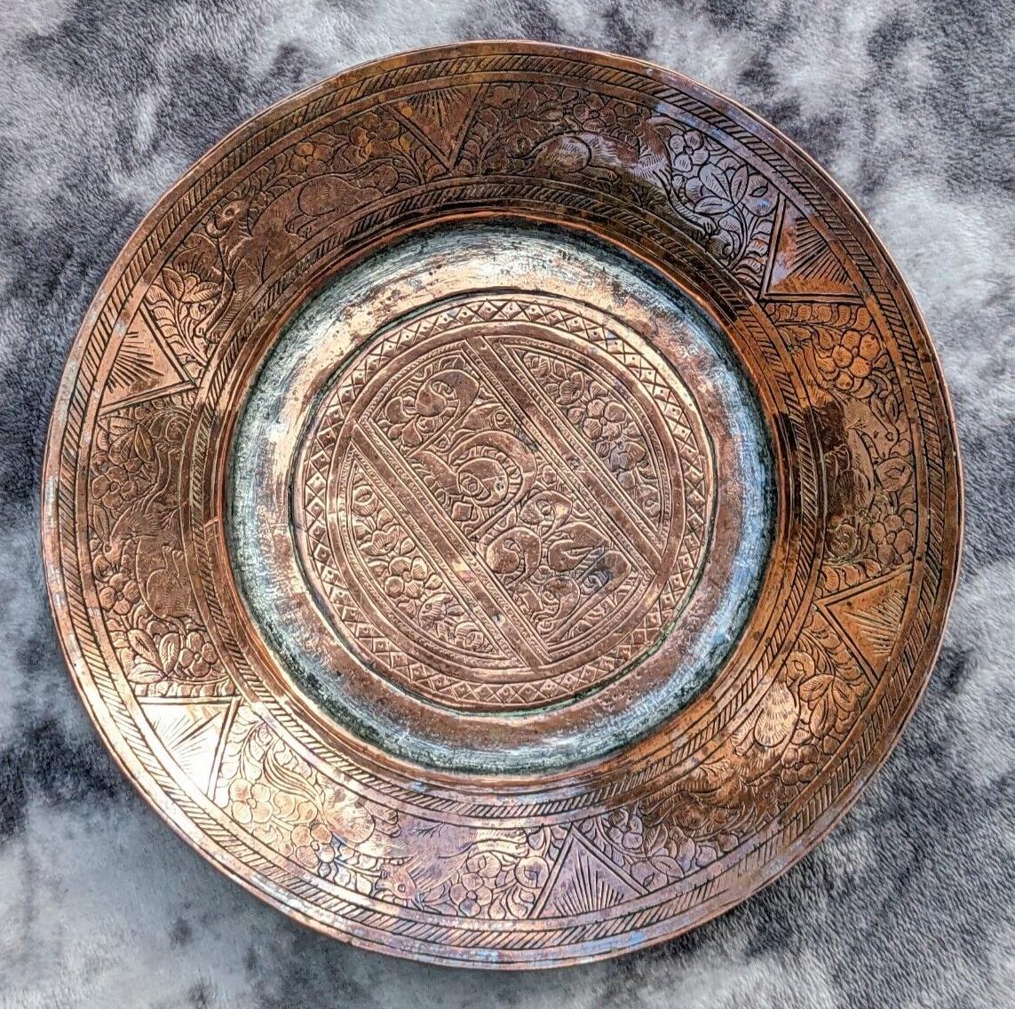 19th Century Islamic Ottoman Tinned Copper Antique Dish Engraved Calligraphy Script Animals