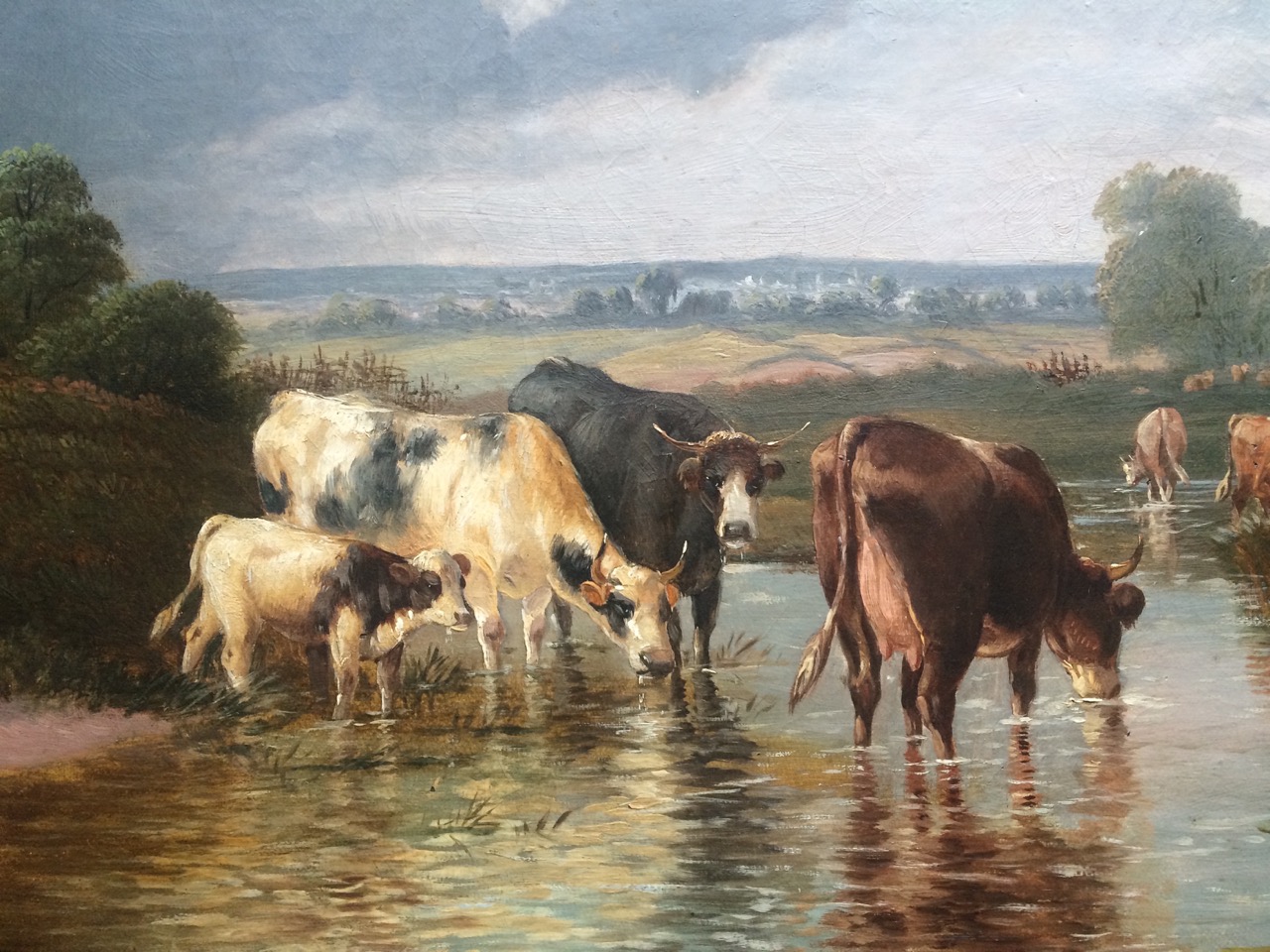 19th Century Landscape Oil Painting Cattle Watering (Listed Artist) c1883 / 43 x 28 Ins (1 of 1)