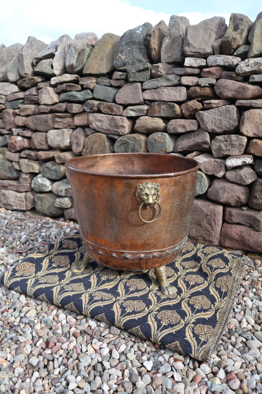 19th Century Large Copper Cauldron Hand Riveted Log Bin with Brass Lions Head Handles & Paw Feet c.1860 (1 of 27)