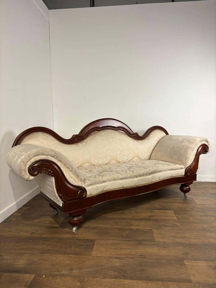 Upholstered in an ivory damask-style fabric, which remains presentable overall, though there are some water marks and signs of age-related wear. The upholstery could be professionally cleaned, or alternatively replaced, offering an excellent opportunity to personalise the piece while preserving its distinguished Victorian form.