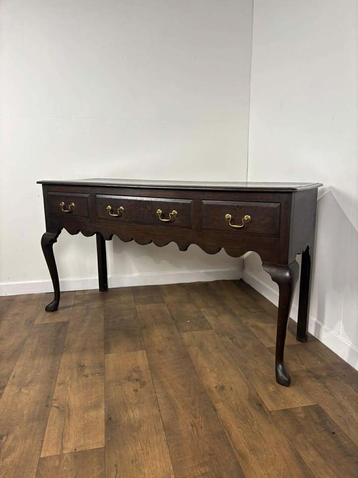 A charming and well-proportioned 19th century oak dresser base, or lowboy, featuring one long central drawer flanked by two shorter drawers, all fitted with brass handles. The piece stands on elegant frontal cabriole supports, giving it a pleasing stance and traditional character.