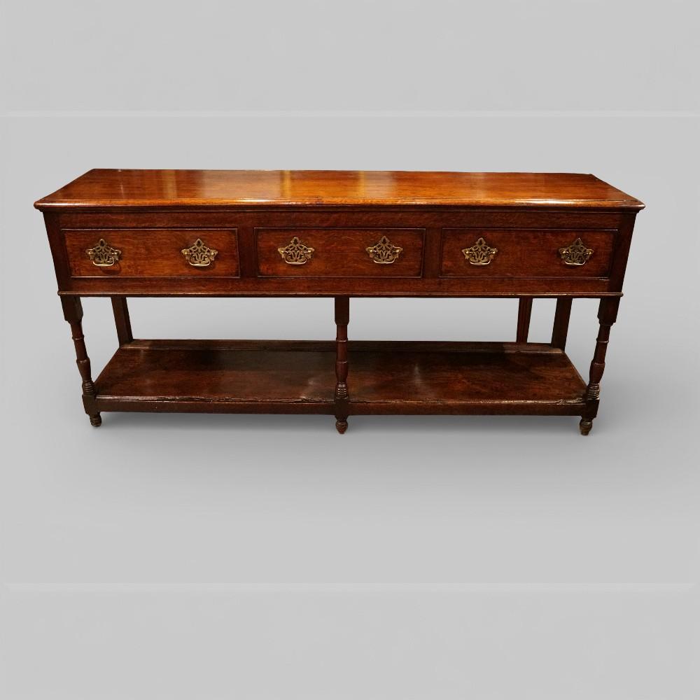 Supported on turned front legs with plain rear supports, the dresser base has a balanced and elegant stance. Its generous width makes it ideal for use as a kitchen dresser base, sideboard, or console, while the open pot board provides additional display or storage space.