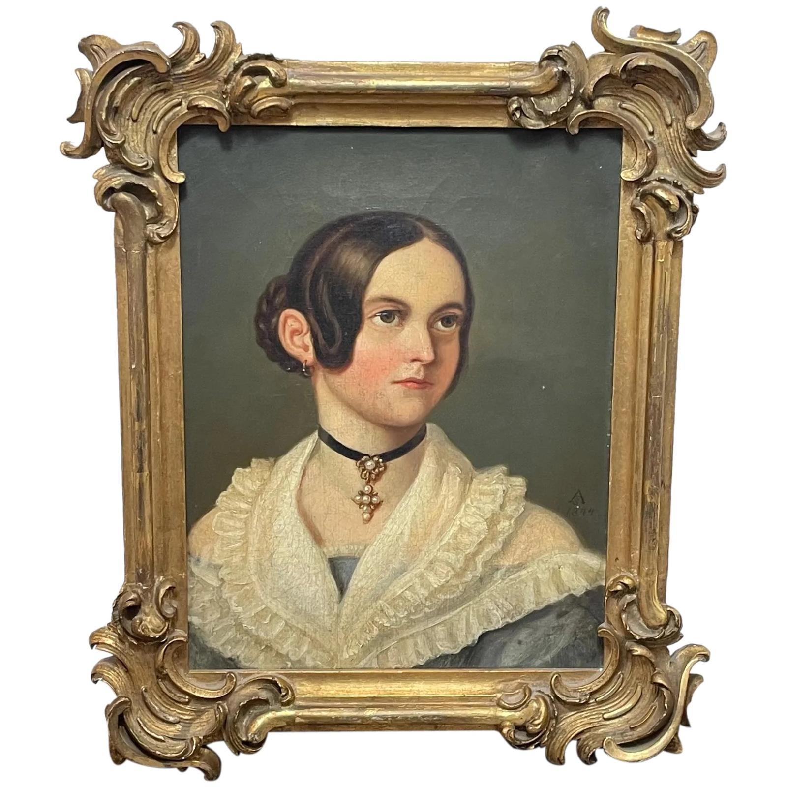19th Century Oil Painting Portrait Young Lady in Blue White Dress Wearing Pearl Pendant