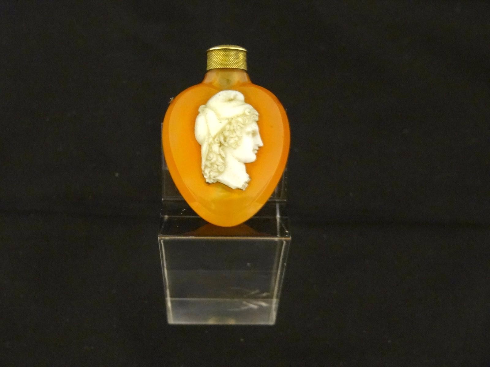 19th Century Orange & White Carved Layerstone Scent Bottle, Heart Shaped, Gold Cap